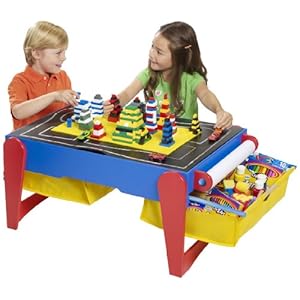 The 7-in-1 Activity Center is a place to build, create, draw and play. It's a train railway play center and a wipe-off dry erase board as well as a chalkboard. It comes with a 35-foot paper roll and it folds for storage.